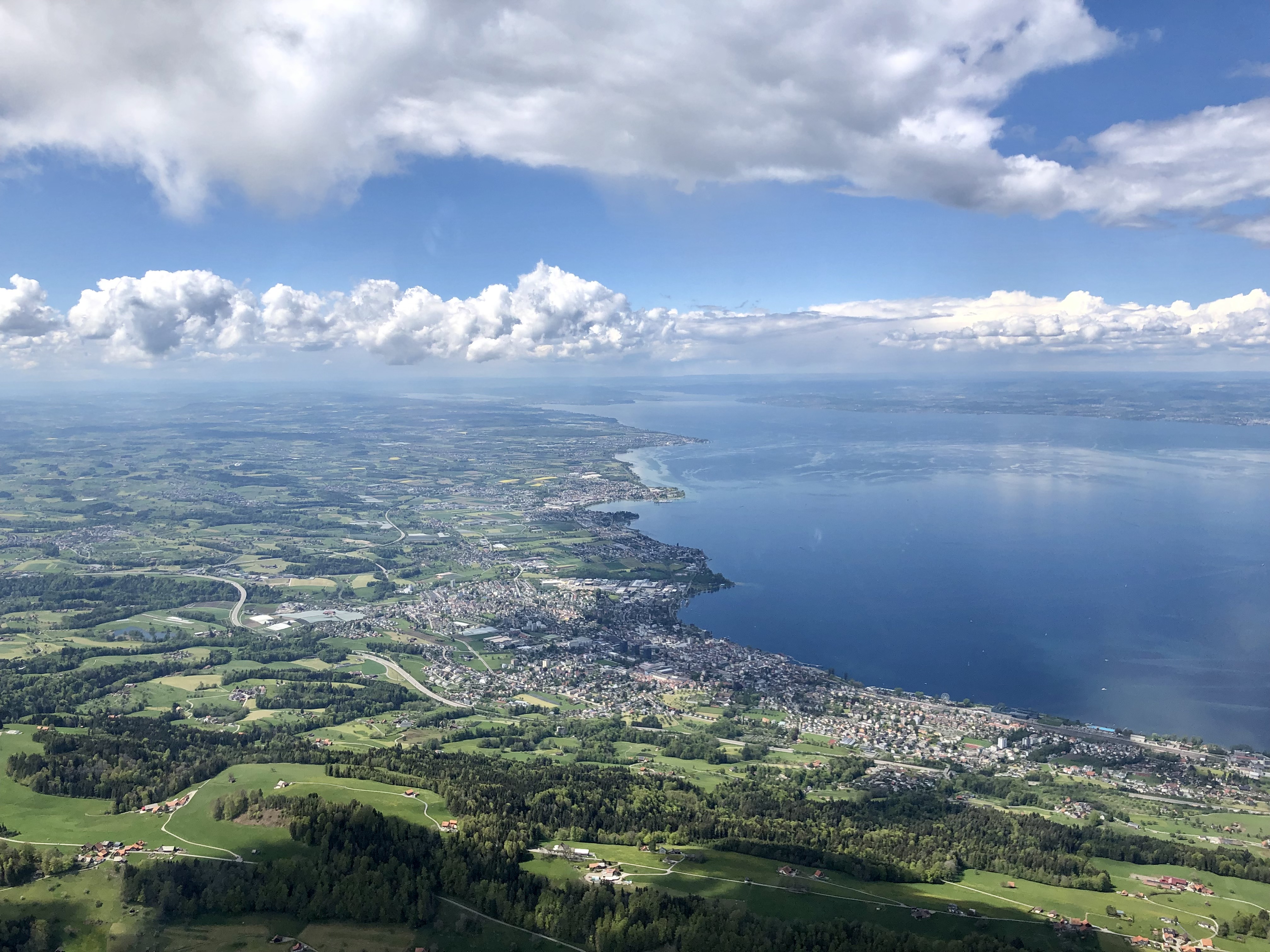 Nach dem Abarbeiten der Checkliste ging es los. HB-KCE von HotelBravo-TriTuNainaFaif, Schleppauftrag Heiden, 1'400m. Daumen hoch zum Flügelmann, ich war breit. Nach dem Abheben musste ich darauf achten, knapp über dem Boden zu bleiben, um danach gemeinsam mit dem Schleppflugzeug zu steigen. Den fehlenden Ballast meines Fluglehrers galt es vorher durch entsprechende Trimmung auszugleichen. Kurz nachdem wir die Sicherheitshöhe von 80m erreicht hatten, wurde es auch schon ruhig über dem Bodensee. Die Kurven im Schlepp meisterte ich nahezu perfekt.