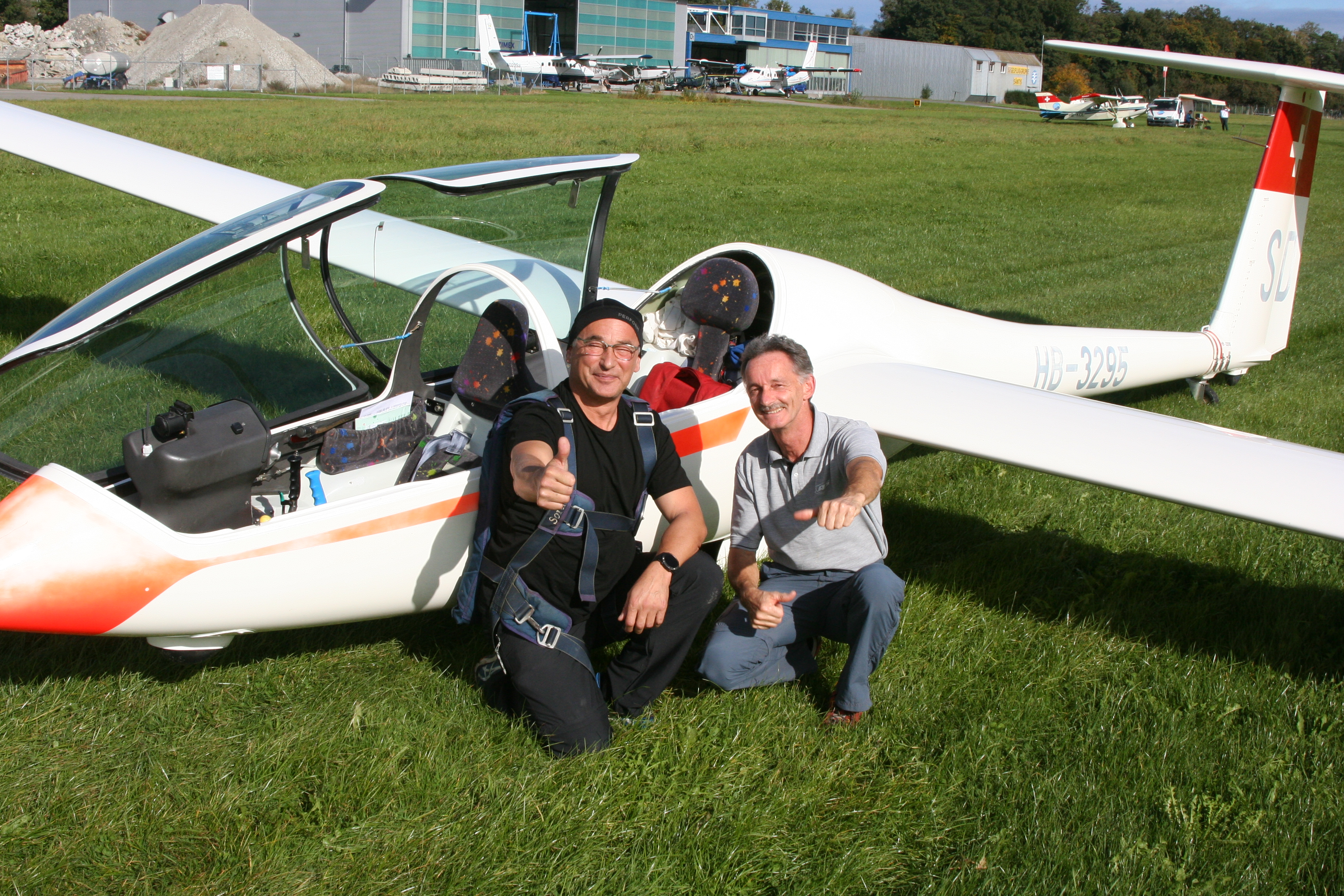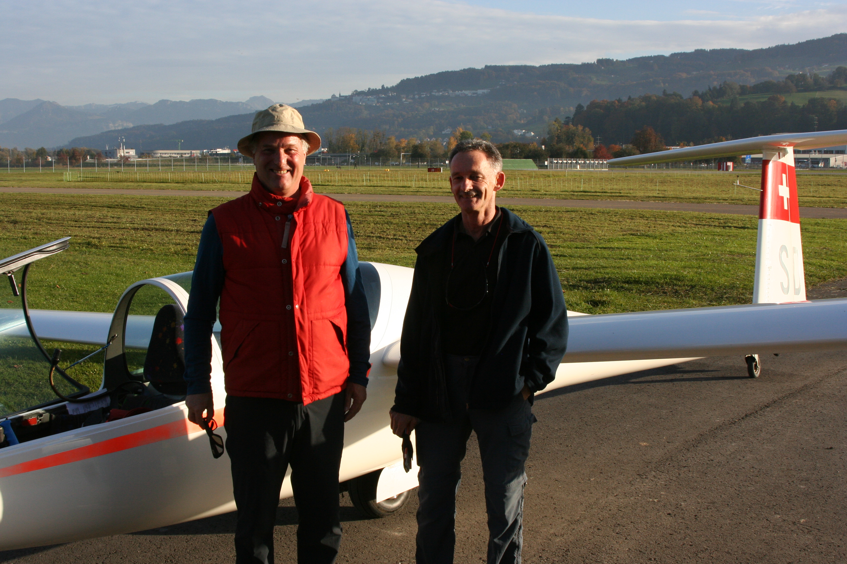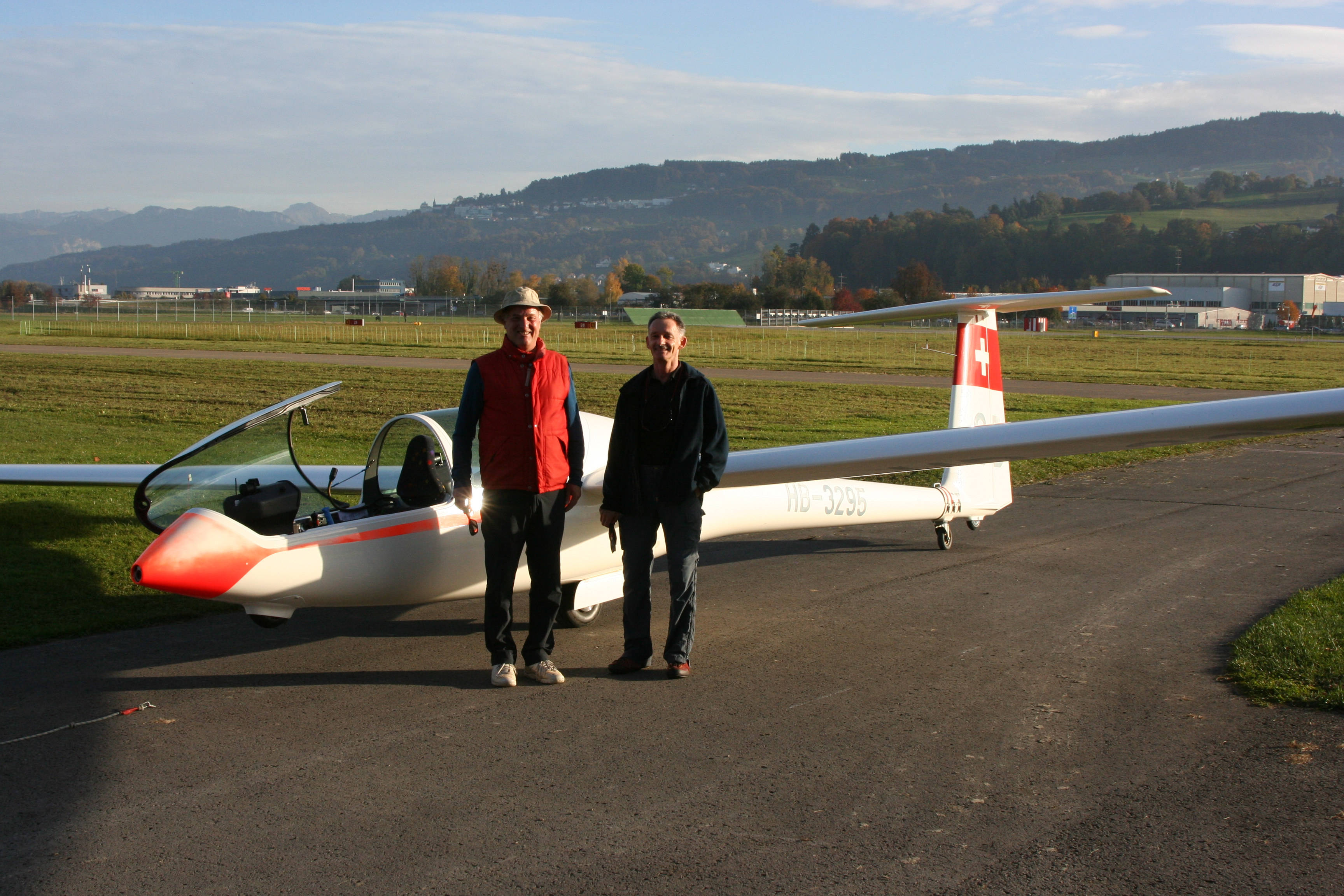 So weit war ich zufrieden mit dem Flugverlauf. Nach der Freigabe durch den Fluglotsen flog ich in den CTR um über der ARA meine Höhe bis auf etwa 230m AGL abzubauen. Am Funk war es ruhig. Ich meldete "HB-3295, joining right hand downwind 28Gras" Der Lotse meldet die Geschwindigkeit und die Richtung des Windes. Daraufhin teile ich dem Experten meine beabsichtigte Anfluggeschwindigkeit mit und trimme den Glider auf 110 km/h. Der Übergang von der Base in den Final ging problemlos. Ich hatte die Pistenachse auf Anhieb vor mir. Mein Anflug im Final war wie auch in den Flügen zuvor, eher hoch. Mit anfangs voll ausgefahrenen Luftbremsen konnte ich den optimalen Gleitpfad auf den Aiming Point schnell einstellen und die Luftbremsen wieder etwas einfahren. Ich sagte mir, nur nicht zu kurz kommen und zu früh aufsetzen. Das Abfangen vor der Pistenschwelle und das Gleiten bis zum Aufsetzen gelang ohne Probleme. Der Aufsetzpunkt passte. Jetzt galt es nur noch die Flügel bis zum Stillstand waagerecht zu halten. Im Anschluss an den Flug fragte mich der Experte wie ich den Flug fand. Ich sagte der Start war etwas unruhig aber der Rest sei ganz ok gewesen. Daraufhin der Experte: " Dem kann ich nicht zustimmen. Das war nicht ganz ok" … "das war ein sehr guter Prüfungsflug. Ich gratuliere dir zur bestandenen Prüfung."