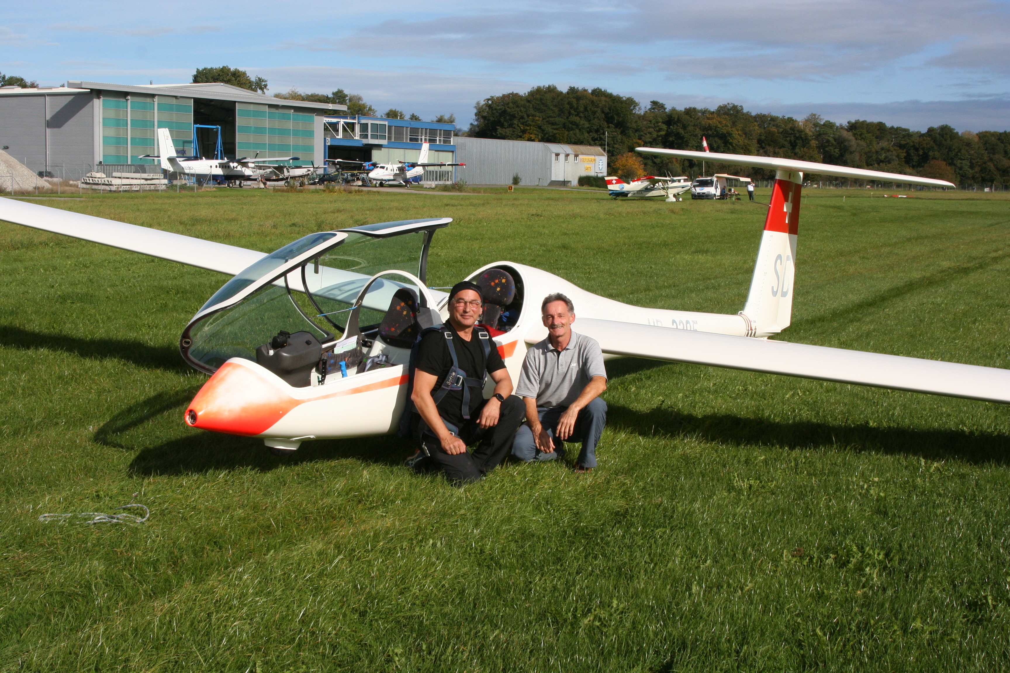 Lasst mich aber die Geschichte von Anfang erzählen, denn obwohl das Segelfliegen einer meiner Bubenträume ist, beginnt sie genau genommen am 26.05.2018 anlässlich eines «Tages des offenen Cockpitts» (TOC). Rein zufällig traf ich in einem Café einen von mir sehr geschätzten Kollegen aus der Gleitschirmgruppe, ich flog lange Jahre einen von ihm konstruierten Schirm. Er ist selber auch ein ausgezeichneter Kunstflugpilot und auch Segelflugpilot in der Segelfluggruppe Säntis. Nach dem angeregten und erfreulichen Gespräch mit ihm hat es mich gepackt, und meine Frau Sandra und ich machten uns gleich auf zum nächsten TOC bei der SGS (Segelfluggruppe Säntis) Altenrhein. Dort hat diese äusserst engagierte und erfreuliche Fliegergruppe ihren Hangar und eine Graspiste für Starts und Landungen.