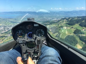 Im Juli 2018 gab es bei der SGS, wie jedes Jahr um diese Zeit, ein Segelfluglager. Mit einer ganzen Woche Intensivtraining kam ich schon recht weit und durfte mit dem erfahrensten Segelfluglehrer in der Gruppe schon einen Flug in die Alpen unternehmen. Das war eine ganz grosse Erfahrung für mich. Ich durfte die Thermik am Breithorn selber erfliegen und unter Anweisung des Fluglehrers den Segelflieger selber fliegen. Der Rückflug führte uns sogar hoch über den Wolken zurück, weil es in den Alpen bis fast 2'800 Meter Höhe ging und die Basis Richtung Rheintal tiefer lag. Es war wie Schweben, und zuerst glaubte ich, es könnte ewig so weiter gehen. So konnte ich noch bis Ende Oktober Flug an Flug reihen und lernte stetig dazu. Am 13. Oktober 2018 durfte ich bereits den ersten Alleinflug mit dem Grob Astir unternehmen.
