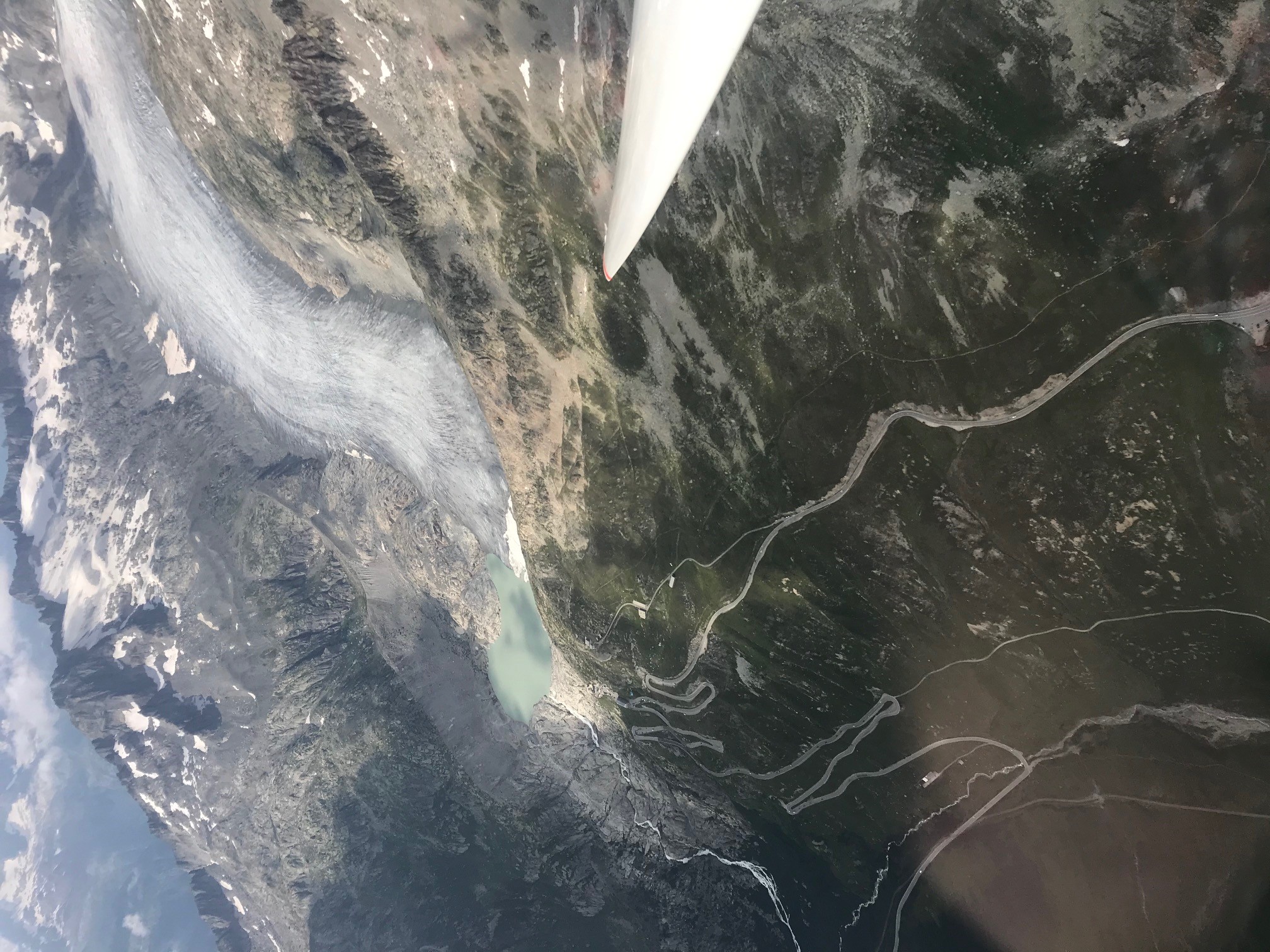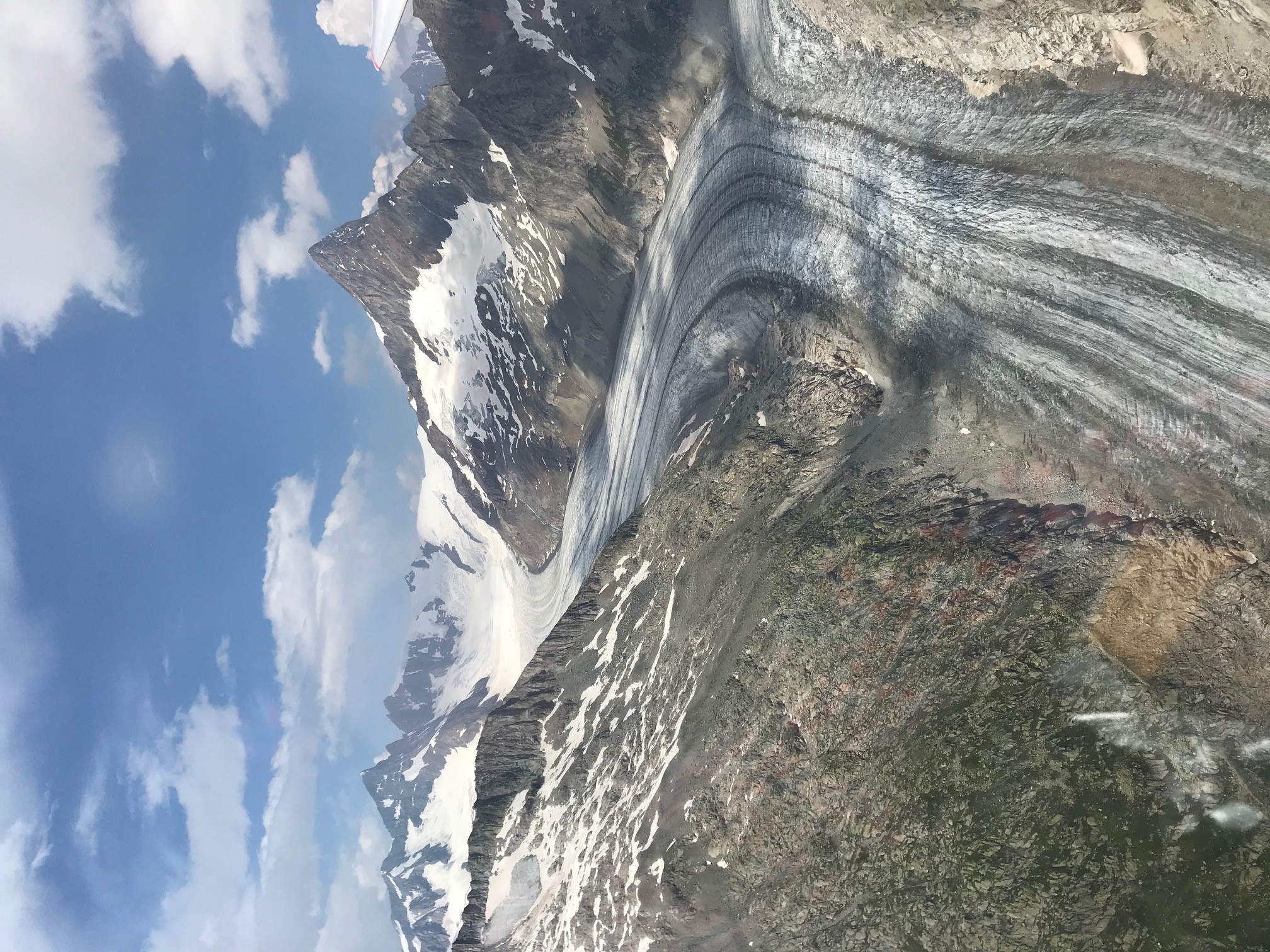 Montagmorgen: mein erster Alleinflug – sitzt man einmal im Flieger, gibt niemand mehr Hinweise! Der Schlepp mit dem Robin war sehr gewöhnungsbedürftig: das beste Steigen findet möglichst nahe an den bewaldeten, von der Sonne aufgeheizten und mässigen Hangwinden angeströmte Südosthängen. Saumässig ruppig stiegen wir nach oben bis über die Galmihornhütte – volle Konzentration wird zur Lebensversicherung. Die Lernkurve stieg jedoch mit jedem Schlepp, sodass ich mich beim Letzten - der insgesamt vier - relativ wohl fühlte. Nach dem Klinken auf der ersten Krete (ca. 2500m) ist Hangsegeln dran – das Gelände geht wellenartig, Stockwerk für Stockwerk nach oben bis zu den Gletschern und den Viertausender Richtung Berner Alpen – man fliegt so zu sagen fast immer unterhalb der das Wallis säumenden weissen Riesen. Als ich mich «hochgeachtert» und gekreist habe bis zur Basis – typisch zwischen 3500 und 4500m – wurde ich verwöhnt von einer atemberauschenden, majestätischen Schönheit. Gleissenden Gletschern, in allen grün-blau Tönen schimmernden Bergseen, schroffen Felsformationen, schrattigen Geröllteppichen und die Sinne bannenden, tiefverschneiten Viertausender!