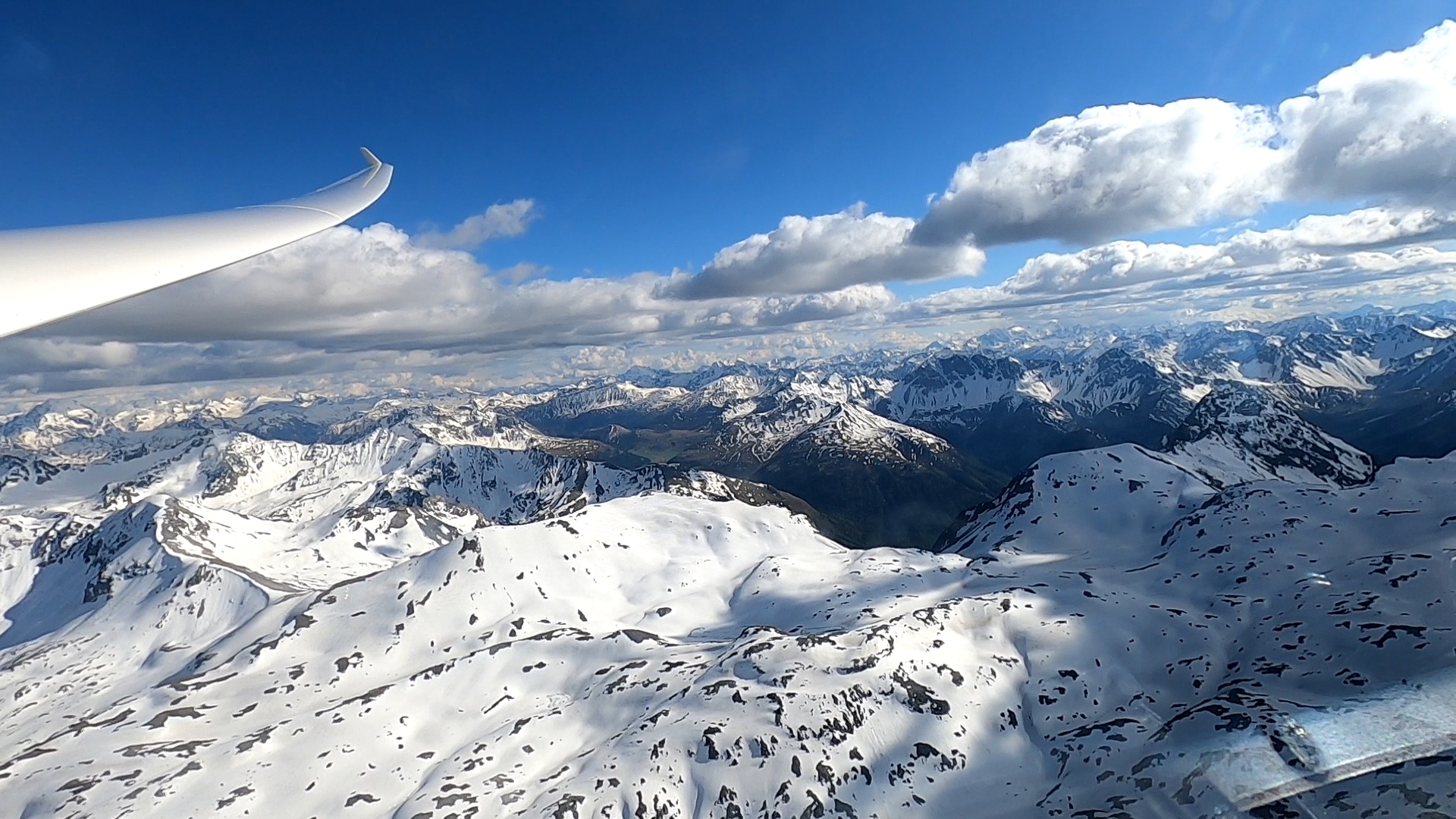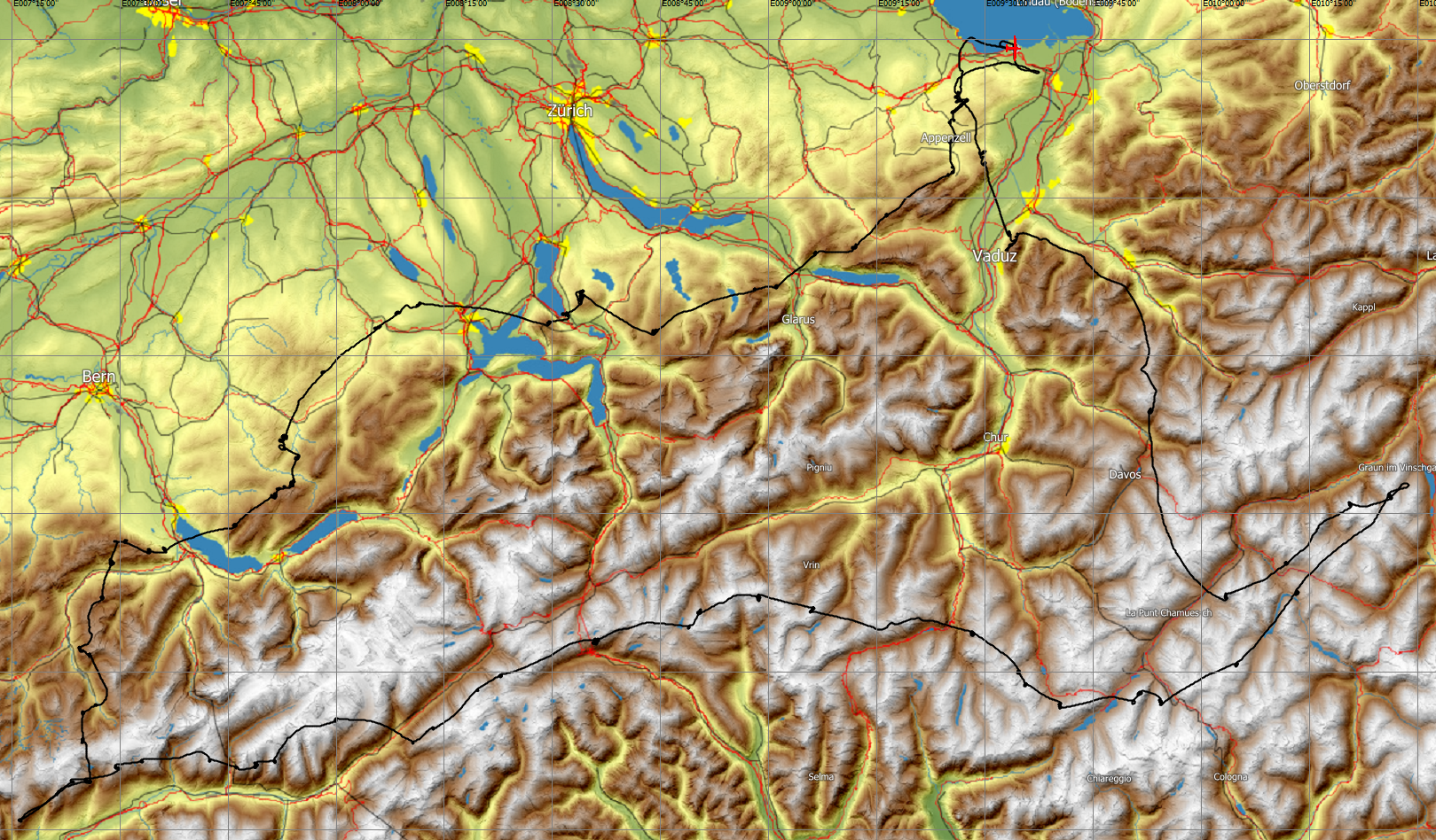 Über dem Hauptkamm ging es vorbei an Nufenen, Gotthard, Lukmanier Richtung Splügen. Am Julier angekommen sah des Unterengadin noch super aus, so entschloss ich mich noch bis zum Reschensee zu fliegen. Ich wendete dort bei einer Supersicht (vorallem gegen Süden) und Flog wieder Richtung Zernez. Zwischen Flüela und Albula gings dann via Madrisa, Drei-Schwestern und Hohem Kasten wieder nach Altenrhein.
